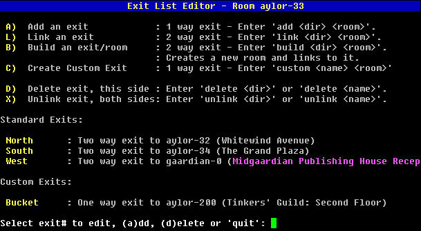 Secondary Menus Much of the complexity in building has been removed by using submenus to replace long syntax in the old area builder. For example, with exits, each exit can be selected from a menu and its attributes edited in the same way as the room data. Whenever you have to choose from a set of flags or from a table of values in the editors, a second menu to prompt you can also be used. In V2 of Aardwolf after several enhancements to exits, this became one of the most complex commands in the entire building process. The new menu system simplifies exits by requiring only basic information to create an exit with the rest settable in a detailed menu editor. For this menu we're switching example rooms to the room North of the incinerator bot in Aylor as this room contains 2 exits to the same area, an exit to a clan area and a custom exit. Selecting 'O' or 'exits' from the main menu brings up the exit editor menu: