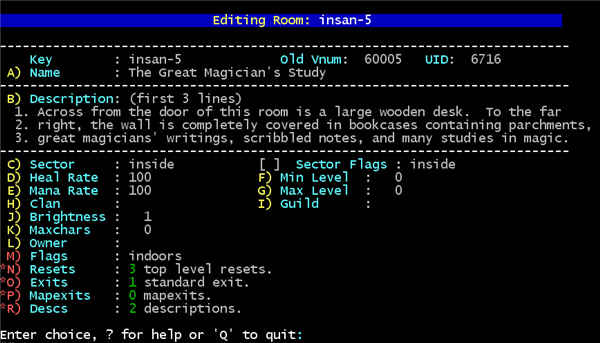 Location: Home / Area Building / Demo Edit Session AardBuilder - Room Edit - Redit Command The main interface to the room editor is the command 'redit'. Redit has the following options: Redit Redit with no arguments takes you into the room editor in your current room. Redit create [number] 'Redit create' makes a new room with default values and sets you to editing that room. The [number] argument is the room number within your area. Note that this is not a vnum, if your area has the key 'matrix' and you enter number '10', your room key will be 'matrix-10'. Redit free If your area has a max room number allowed, this option will show available room numbers up to a max of 200. If the area has no limit on rooms, this will show the first available 20 numbers. Please try to keep numbers within a tight range - having room numbers 1, 2, 3, 4000 within an area may cause performance issues. AardBuilder - Room Edit - Main Menu The main room editor menu is shown below:
