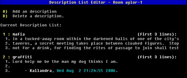Location: Home / Area Building / Description Editor AardBuilder - Description List Editing Rooms and Objects within the game can have multiple descriptions attached to them. The description list editor is one of the simpler submenu. Using an example room with 2 extended descriptions: