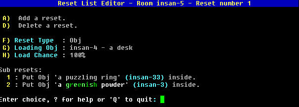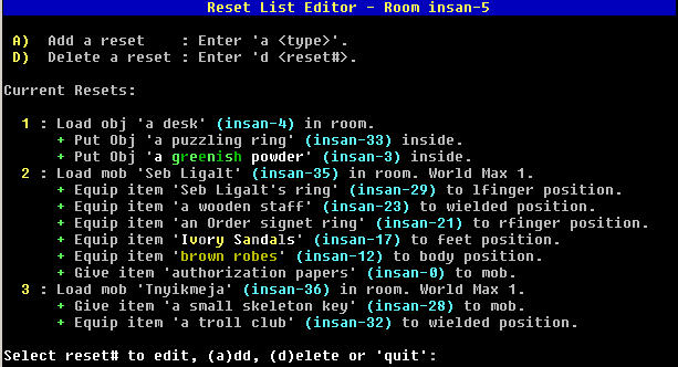 Location: Home / Area Building / Reset Editor AardBuilder - Reset Editing Resets are handled somewhat differently in Aardwolf V3 and more logically reflect how resets actually work. Within a room, there are only 3 valid reset types: - Load a mob into the room. - Load an object into the room. - Randomize the room exits. Resets in a room have their own list of secondary resets that are executed after them. This sounds complex, but all it really means is that a reset to give an item to a mobile or equip it cannot exist without the mobile reset being there in the first place. Same with resetting an item inside a container. Having resets contain their own list of secondary resets means we can add further resets type later on. There is no limit to how many levels deep resets can be - you could in theory have an item in container in a container in a container worn by a mob. Building standards dicate that you cannot go beyond two levels (item in container on mob). Using the same room we have been working with in Insanitaria is a good example because it has every type of reset except a random exit. Selecting 'resets' from the main room editor screen for this room brings up the reset menu: