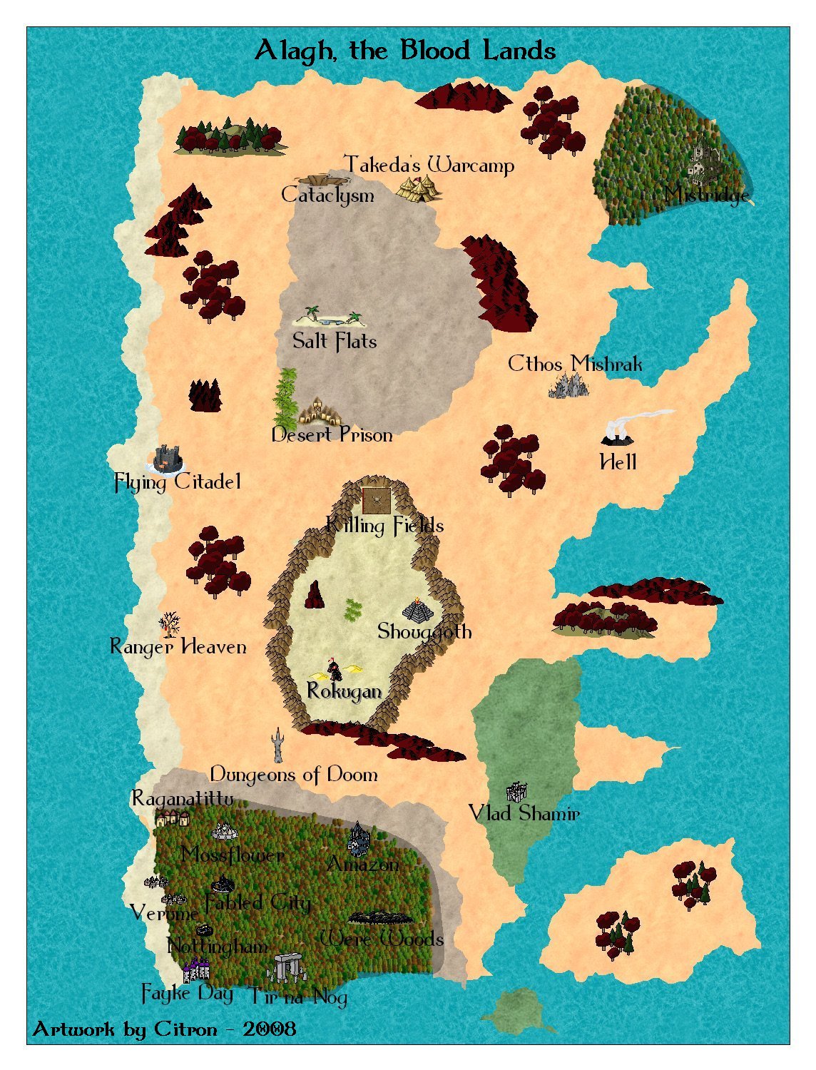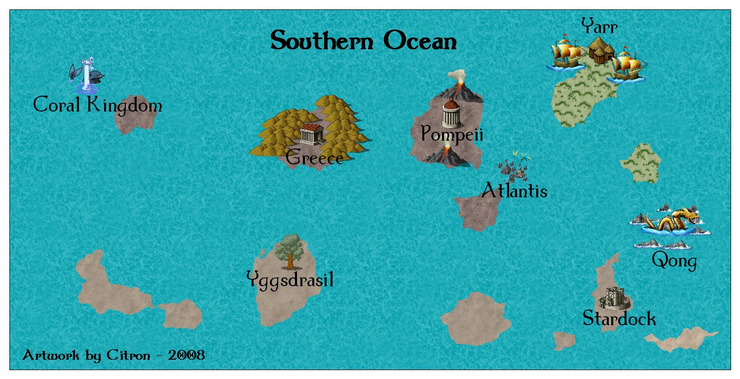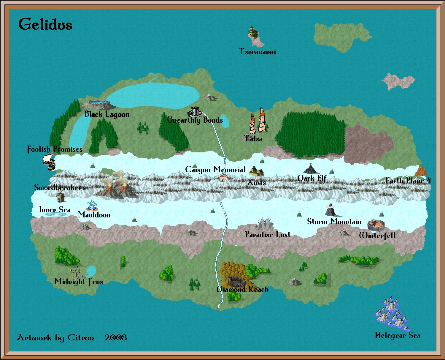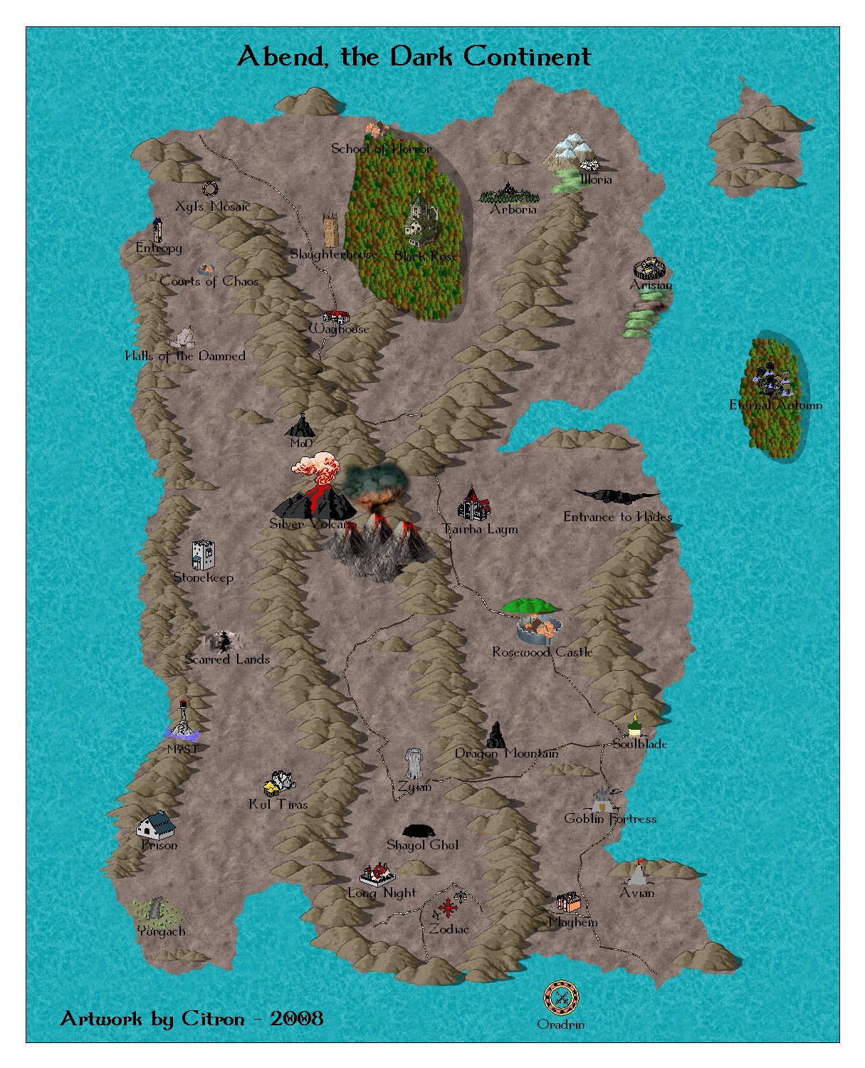 Location: Home / Game World The Aardwolf adventure is set in Andolor, meaning 'greatest world' in ancient tongue. Andolor orbits a single sun, but unlike other worlds, does not rotate. Andolor's three moons and several large planets between Andolor and its Sun give the impression of rapidly changing day and night. There are no seasons or changes in climate. Tropical areas stay tropical,the frozen land of Gelidus remains frozen. In terms of geography, much of the vast Oceans of Andolor remains unexplored. Many islands exist within these oceans, guarding many mysteries. While Andolor is not completely circular, head in any direction long enough and you will arrive very close to where you started, assuming you survive the journey. Four main continents have been discovered so far on Andolor. Mesolar The Continent of Mesolar is the central hub of civilization on Andolar. Great cities and small towns have formed alliances and treaties, established extensive road systems, and negotiated trade routes and diplomatic ties. As a result, Mesolar is the safest place for the average citizen to live, and therefore the most heavily populated by the "civilized" races. Click each thumbnail for the detailed map. Abend To the west of Mesolar, past the 'Forbidden Waters', or Banalog Ocean, lies the dark continent of Abend. Constantly in twilight, much evil is rumored to exist here. Few have returned from adventures to the West, so only lore and legend remain. The mountains and rocky terrain are fabled to be infested with every vile sort of creature, and adventurers who seek their treasure there are advised to walk warily. Alagh To the east of Mesolar, across the Aphasian ocean is the Blood continent of Alagh. Alagh means "battle glory" in ancient tongue, an aptly named continent ravaged by centuries old battles. Alagh is also home to the great Eastern Desert and tropical jungles to the South, and the waters of the Lem-Dagor ("into battle") to the west. The hills and barren plains of this war-ripped land are stained in the blood of fallen innocents, and the trees themselves bloom with blood-red foliage in memory of the blood spilled here. Gelidus To the North of Mesolar is the frozen continent of Gelidus. Contained on the side of Andolor permanently away from the sun, the continent is covered in snow and ice formed from the frozen E'a Siirima, Elvish for 'into liquid'. Across the coldest point of Gelidus is a vast and icy mountain range, where ancient glaciers and vast forests of ice stand their ancient watch. Very little civilization resides in this frozen wasteland, but ruined fortresses and retreats of the monsters who love cold await the eager hero who ventures here. Oceans The waters of the Iridian, or iridescent sea, lay to the south of Mesolar. Various societies have started to form within the waters and on the few islands that have formed over the ages. Rumored are civilizations which have even sprung up under the ocean waters themselves. The Iridian Sea abuts against a vast, uncharted ocean, in which islands can occasionally be found by the lost traveller. There are even fables and legends, scorned by learned navigators and scholars, that another continent resides within these uncharted waters...no trace of this land has been found, at least by any who have returned to tell the tale. Vidblain There is rumor of a 5th continent. Whispers about Vidblain, the "ever dark". The author cannot verify the truth or location at this time.... | |||